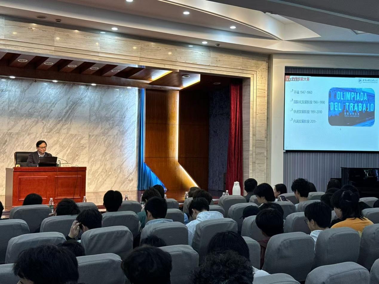 讲座过程中,徐腾岗从世界技能大赛为出发点,向同学们详细的介绍了世界技能大赛的起源与发展勃兴,并指出世界技能大赛是一个展现中国青年锐意进取,勇于拼搏奋斗精神的重要平台。通过“榜样的力量——2022年上海第46届世界技能大赛梦想大使陈亦凡”的例子,讲述了一个女孩稳扎稳打学习专业知识,刻苦奋斗提升综合素质,精益求精雕琢技能素养的成长历程,呼吁同学们应当用技能点燃梦想,照亮生活。